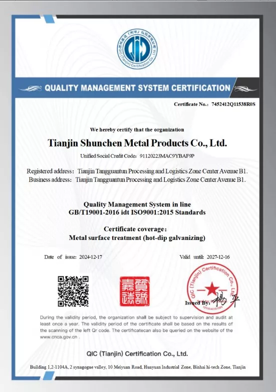 Bagian U Baja Industri Shunchen telah memperoleh sertifikasi mutu ISO9001, memenuhi standar nasional. Kami menyediakan laporan pengujian material pihak ketiga dan sertifikat ketebalan galvanis. Produksi kami menggunakan jalur produksi yang canggih, melalui 12 langkah proses yang ketat, didukung oleh keahlian produksi selama lebih dari 20 tahun. Kami telah mempertahankan rekam jejak selama 12 tahun tanpa adanya pelanggaran kontrak dan tidak adanya insiden kualitas tahunan. Selama proses produksi, tiga perlakuan pasivasi diterapkan untuk meningkatkan ketahanan anti-alkali produk galvanis. Setiap produk jadi mengalami pengeringan, pemeriksaan, dan penyelesaian sebelum dikemas dan dikirim. Perusahaan ini memegang sertifikasi ISO 9000, sertifikasi sistem 3A, dan sertifikasi EU CE. Dengan 12 langkah proses dan mekanisme inspeksi komprehensif tiga tingkat, kami tidak mencapai insiden kualitas dan keselamatan tahunan serta mempertahankan rekor nol pelanggaran kontrak selama 12 tahun.